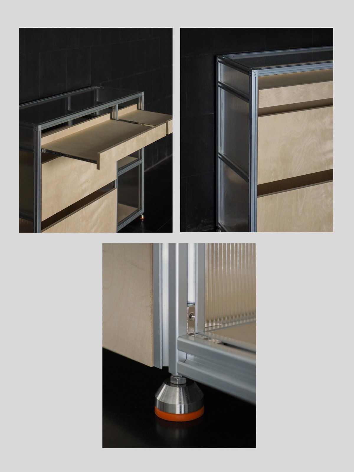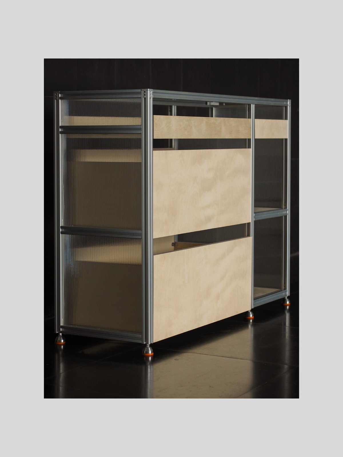 铝型材餐边柜,结合抽屉收纳与开放展示功能。铝型材框架搭配海洋板抽屉和长虹亚克力门板,工业结构与生活美学的完美融合。提供DIY款和预组装款。